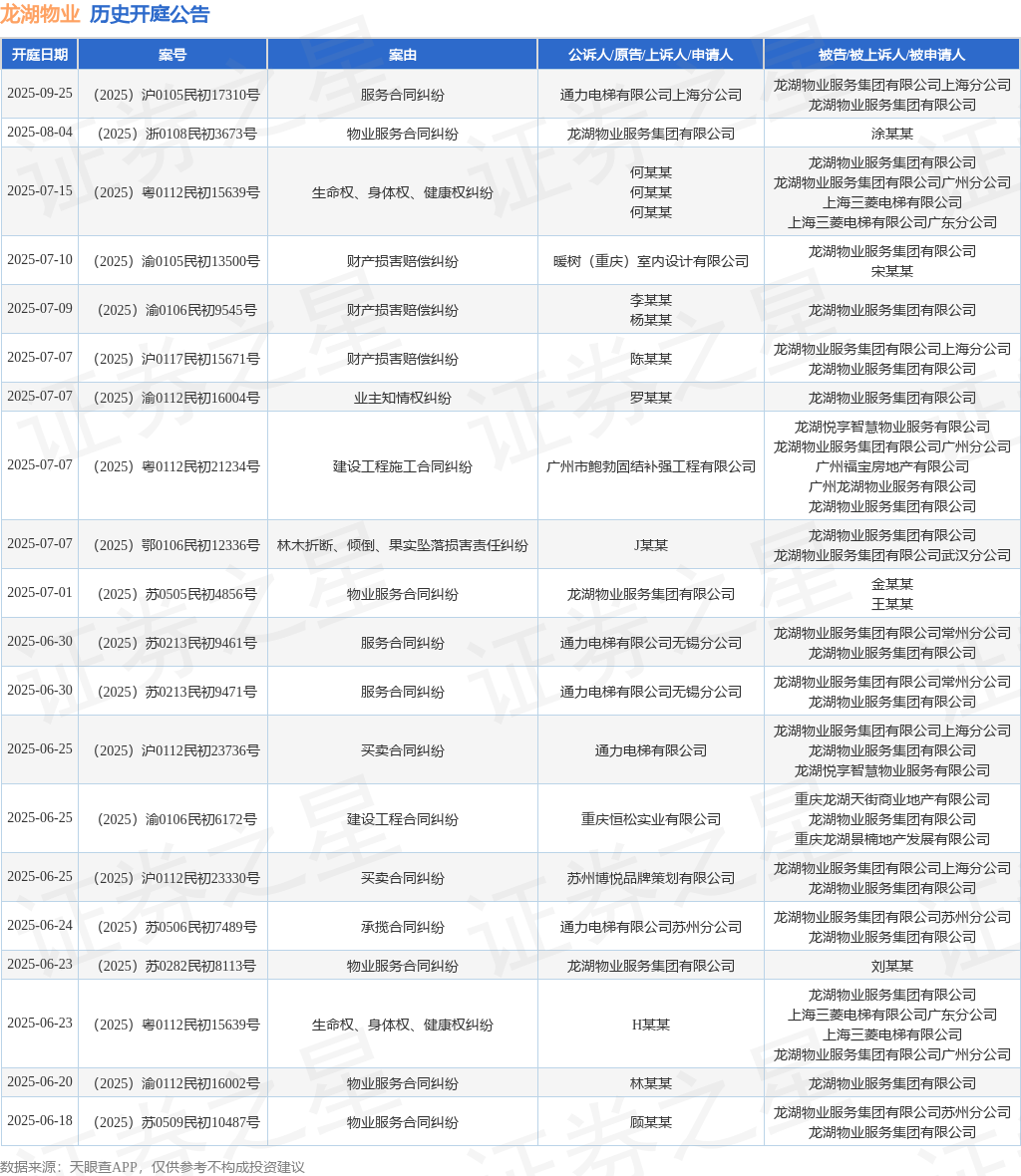 案号:(2025)渝0106民初8612号审理法院:重庆市沙坪坝区人民法院案由:生命权、身体权、健康权纠纷当事人信息: 原告/上诉人:周某某 被告/被上诉人:龙湖物业服务集团有限公司开庭日期:2025年6月17日根据统计,近一年内以龙湖物业服务集团有限公司为当事人的历史开庭公告有950则,其中案由为“物业服务合同纠纷”的公告以739则居首,其次为“财产损害赔偿纠纷”有52则,“服务合同纠纷”有37则。历史开庭公告(前20条)如下: